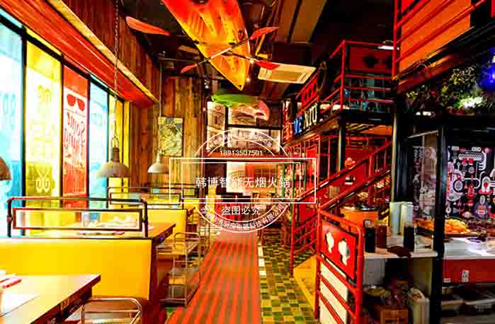 店內(nèi)采用許多年輕元素,時尚活力涂鴉,餐廳處處充滿趣味格調(diào)和時尚新鮮感,給顧客營造一種輕松愉快的環(huán)境。在這吃火鍋你不用擔心油煙味,因為它選用了韓博智能無煙火鍋設備,節(jié)能、安全、高檔、環(huán)保,油煙去除率高達99%。
